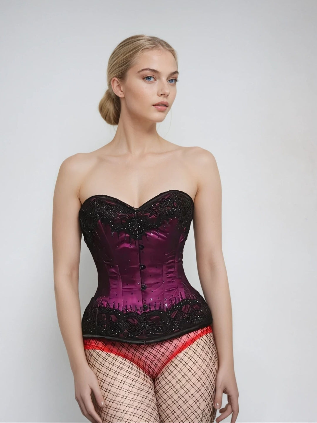Black and Magenta Embroidered Overbust Corset