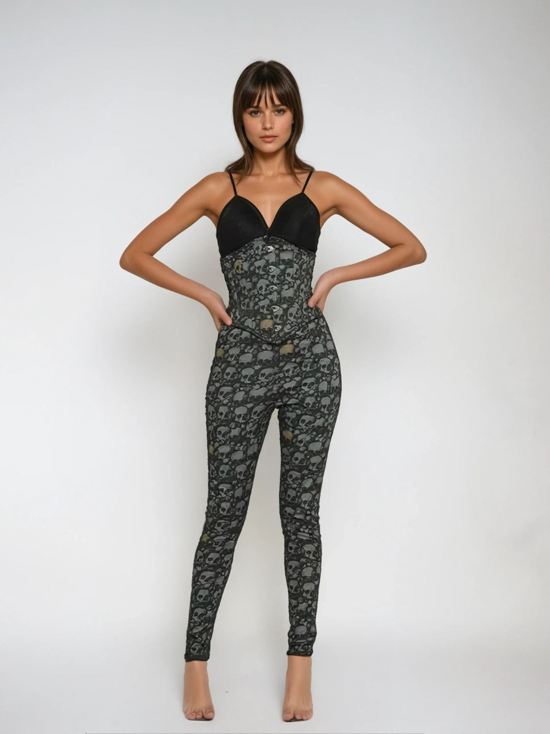 Grey Skull printed Waist Reducing Authentic Steel Boned Underbust Corset Dress
